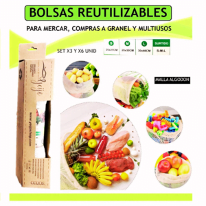 BOLSAS REUTILIZABLES PARA MERCAR,SET X3, TELA MALLA ALGODÓN